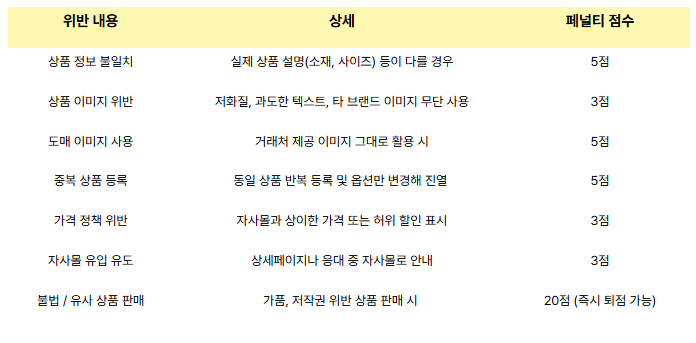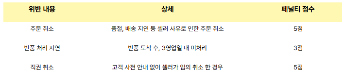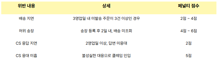 페널티 점수를 꼼꼼히 숙지하셔서 원활한 판매 활동을 지속하는 것이 매출 성장의 핵심! 🚀