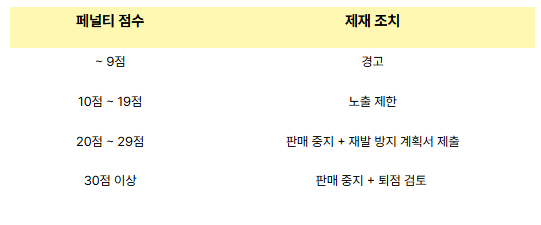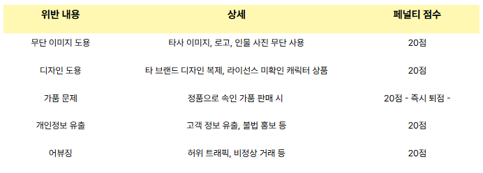 위반 시 각 항목별로 페널티 점수가 부과되고, 누적 점수에 따라 경고 > 노출 제한 > 판매 제한 > 퇴점 등의 제재조치가 적용되고 있어요.