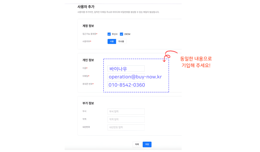 👉🏻 사용자 추가 화면에 바이나우를 추가 등록해야 원활한 29CM 연동이 가능합니다!